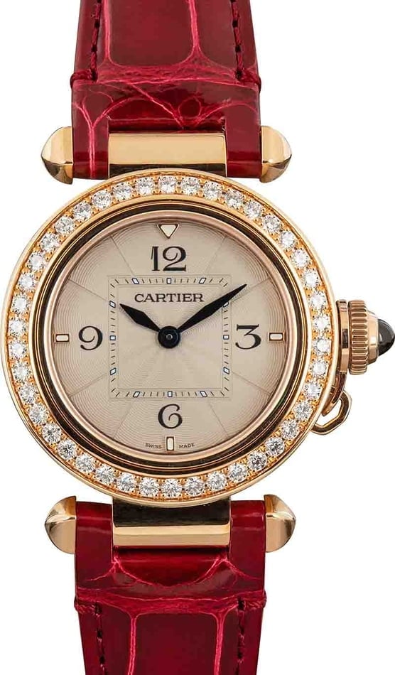 Pre-owned Cartier Pasha de Cartier ref WJPA0017 is in excellent secondhand condition. This pre-owned Cartier will look exceptional on the wrist anywhere you roam, featuring exquisite rose gold, supple leather, and sparkling diamond hour markers. It makes a stand-out statement piece worn alone on the wrist or stacked with other bracelets. Ref. WJPA0017 also features Cartier’s trademark sword-shaped hands, geometric minute track, and crown decorated with a gorgeous blue cabochon. The famous Cartier Pasha is also distinguished by a perfectly round case and crown cap. Take advantage of the chance to add this inspiring Cartier to your jewelry box today. It is in stock right now in excellent secondhand condition.