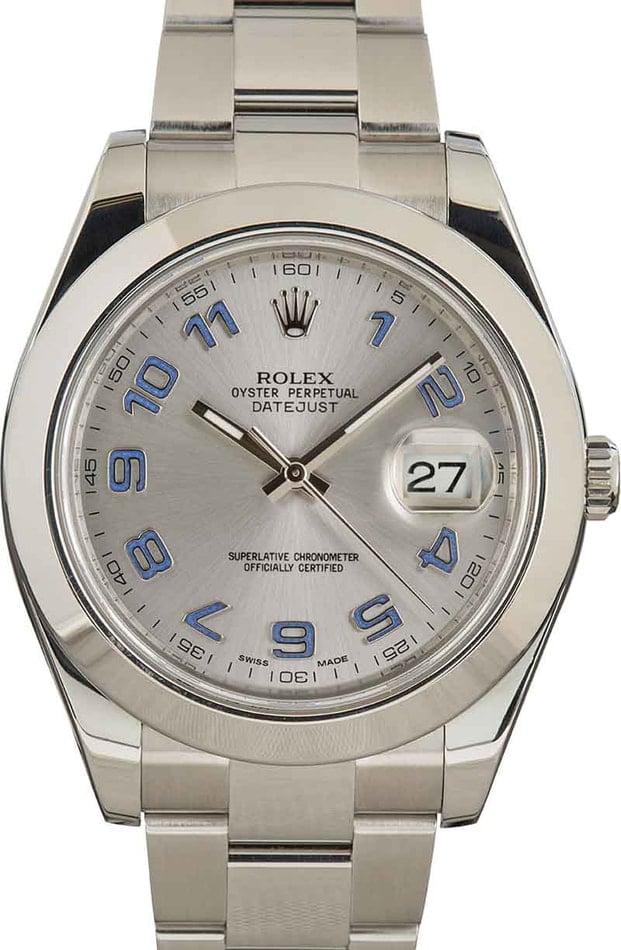 Pre-owned Rolex Datejust ref 116300 (2016). The larger model Datejust II was introduced to the market just a few years ago in 2009. Similar to the 1940s Datejust, the ref. 116300 is equipped with a waterproof screw-down crown, a perpetual movement with self-winding, and a jump date mechanism on the dial. These features have since been upgraded to offer a singularly reliable reading and now include a Twinlock double-sealed screw-down crown and a chronometer-rated calibre 3136 movement with anti-shock technology. The ref. 116300 is a contemporary take on the Datejust II and consists of a stunning 904L-grade Oystersteel finish, a three-link Oyster bracelet closed by an Oysterclasp, and a matching silver dial with lilac hour markers.