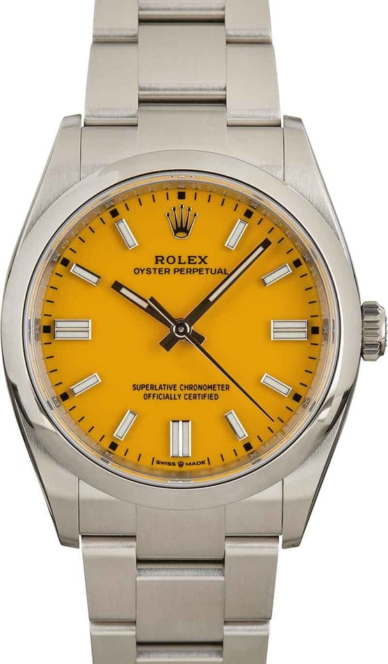 Pre-owned Rolex Oyster Perpetual ref 126000 (2021) sports a unique yellow dial. This watch face is widely believed to be inspired by the vintage Stella dials produced by Rolex beginning in the 1970s, complete with similar hues. Overall, this design set is a departure from the traditional design codes often accompanying the OP collection, making it a widely sought-after variation among modern collectors. Aside from its collection-worthy dial, ref. 126000 is also furnished with the next-generation caliber 3230 Perpetual movement with a Paramagnetic blue Parachrom hairspring, high-performance Paraflex shock absorbers, and an impressive 70-hour power reserve.