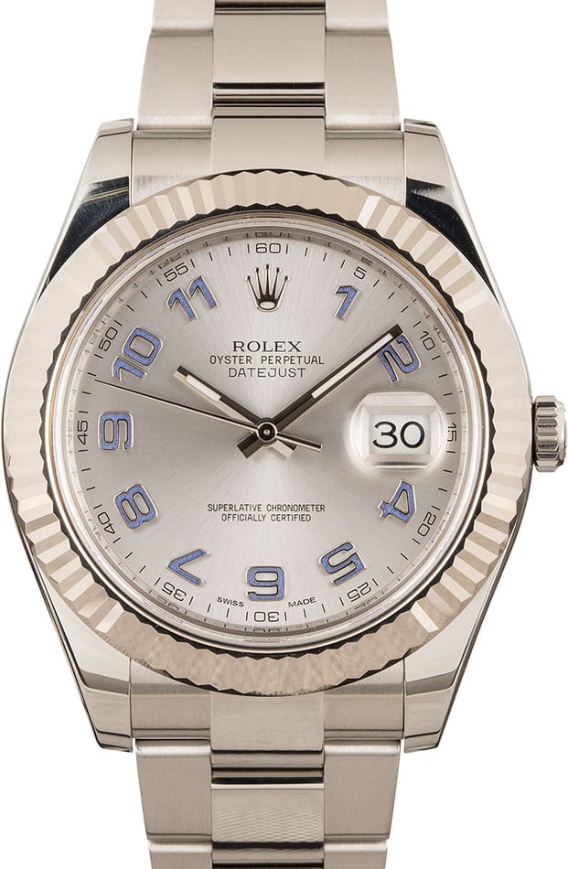 Pre-owned Rolex Datejust II ref 116334 (2017) is the original 41mm White Rolesor Datejust. This series famously introduced the iconic time and date dress watch to the larger 41mm case and the caliber 3156. Even though it has since been discontinued, many collectors prefer this model for its unique proportions and dial color options. The used Rolex 116334 for sale here is one of the few models to feature striking lilac Super-LumiNova, which pairs beautifully with the silvery dial and white metal finish. As with every Rolex dress watch, the case is rated waterproof up to 100 meters and houses a ground-breaking self-winding mechanical movement. We expect this Rolex to be a reliable life-long companion if properly serviced and maintained.