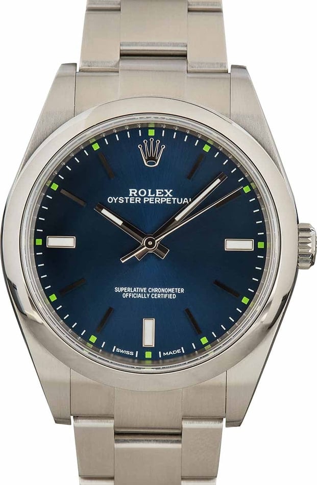 Pre-owned Rolex Oyster Perpetual ref 114300 (2019) sports the recently-discontinued 39mm Oyster case. As of just a few years ago, the men’s collection is only available in 34mm, 36mm, or 41mm. If the unique size and weight of the 39mm Rolex OP appeal to you, the secondary market is currently your only option. Ref. 114300 also notably features unique dial colorways, including the handsome blue dial Rolex for sale here. Luminescent baton hour markers at 3, 6, and 9 o’clock help the wearer keep time at a glance, while contemporary green markers add character to the dial. This model also features the caliber 3132 time-only dial with self-winding and a COSC rating.