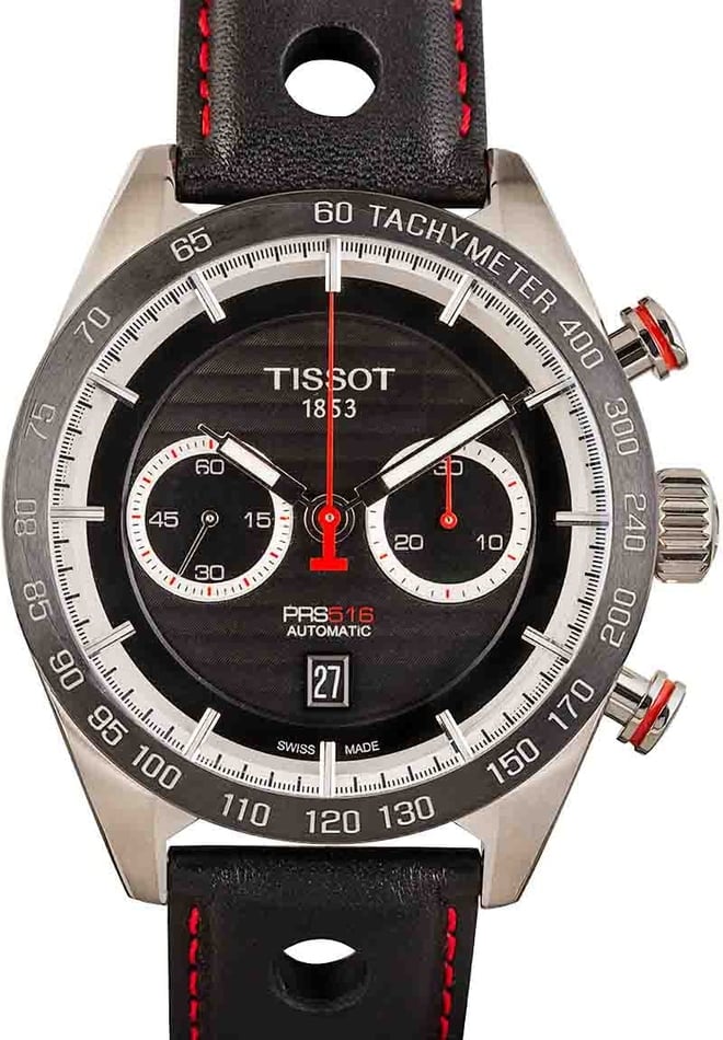 Tissot has a storied history in the world of motorsport, and the PRS 516 Automatic Chronograph is just one of many watches produced by the brand that pays homage to that part of their past. It’s a sleek interpretation of a classic chronograph in sharp black and bright red. Twin registers in white sit on either side of the hands, while the red seconds hand races around the dial once the pusher is activated. Ref. T100.427.16.051.00 also features a Tachymeter bezel, a standard feature on many classic chronograph timepieces. The example you see here also features a striking stainless steel case and a black perforated leather strap with bright red stitching.