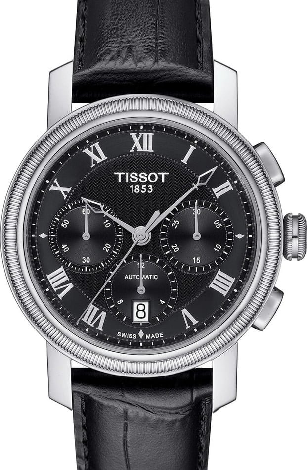 This edition of the mens Tissot Bridgeport features an exquisite dial adorned with contrasting Roman hour markers, elegant hands with diamond-shaped tips, a date display at the 6 o’clock position, and chronograph register. The textured center of the dial adds dimension while silver accents create a sophisticated contrast, giving this Tissot immense character. The ref. T097.427.16.053.00 is presented in stainless steel and leather and is powered by the coveted ETA/Valjoux cal. 7753 movement. It features a 42mm diameter and is just robust enough to make a bold statement without overtaking the wrist. This edition is presented in unworn condition and is ready to join your watch box today.