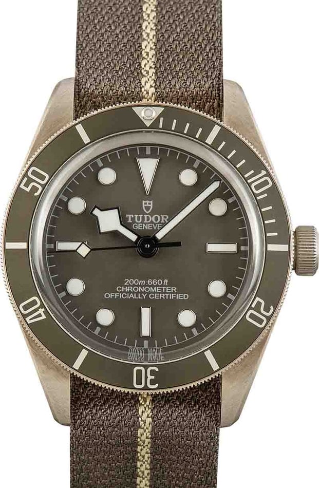 Pre-owned Tudor Black Bay Fifty-Eight ref 79010 (2022) is an intriguing timepiece because it presents the case in 925 silver, an uncommon metal finish in Swiss luxury watchmaking. The cool tone of the silver case pairs well with the matte taupe aluminum bezel and matte taupe dial. The example you see here also features a matching taupe fabric bracelet for a nice, cohesive aesthetic. Other features include a 39mm case with a domed sapphire crystal, water resistance up to 200 meters, a uni-directional bezel with silver gilded graduations, a screw-down crown decorated with the iconic Tudor rose, and the caliber MT5400 automatic movement with a convenient 70-hour power reserve. A truly unique edition of the famous Black Bay.